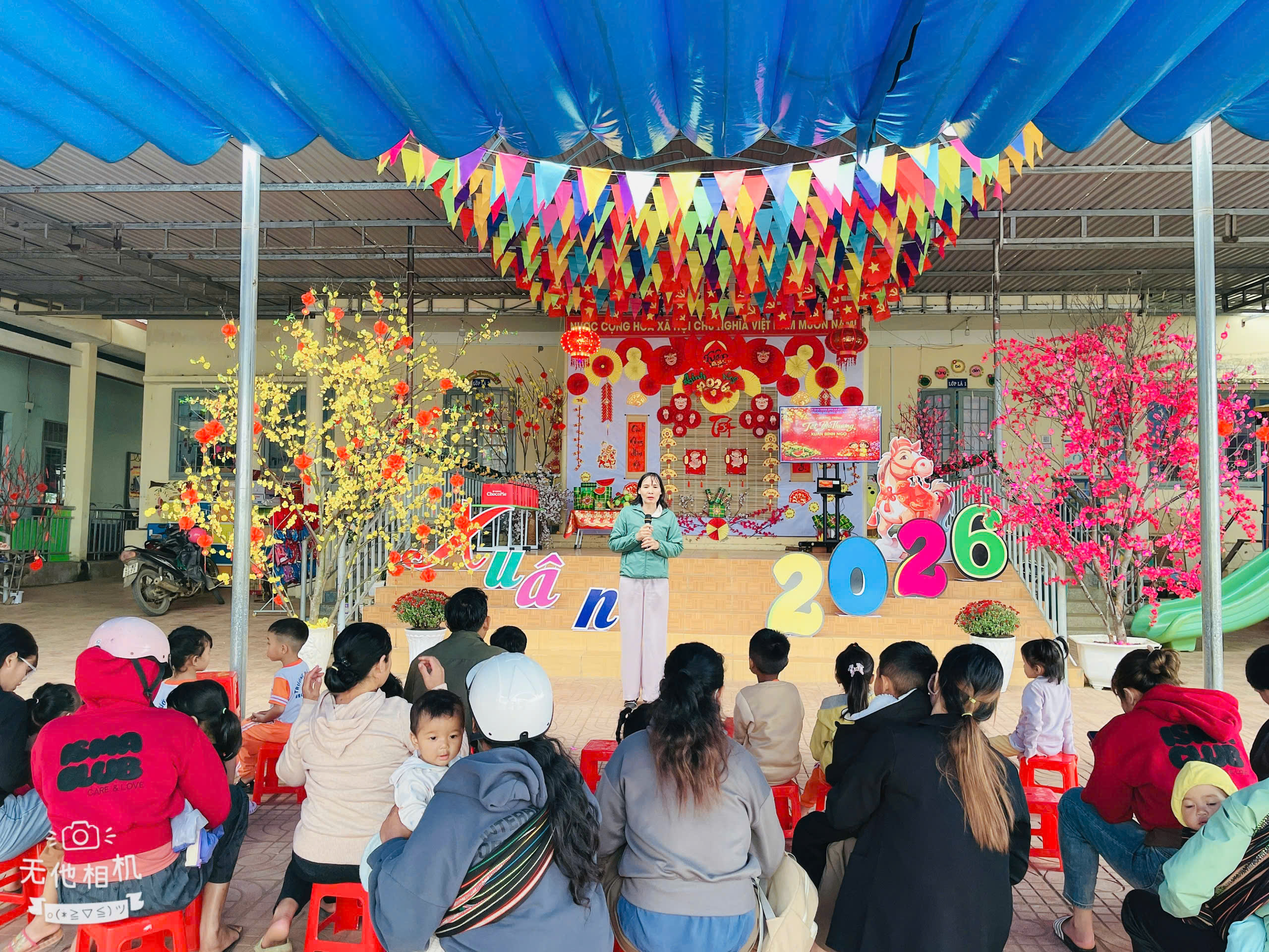 Mở đầu chương trình, cô Phạm Thị Cúc- Hiệu trưởng nhà trường đã có bài phát biểu đầy xúc động, gửi lời chúc mừng năm mới đến toàn thể cán bộ, giáo viên, nhân viên và các cháu học sinh. Trong lời chia sẻ, cô nhấn mạnh ý nghĩa của hoạt động “Tết yêu thương” không chỉ nằm ở những phần quà vật chất mà còn là sự quan tâm, động viên tinh thần, giúp các gia đình có hoàn cảnh khó khăn cảm nhận được sự ấm áp của tập thể nhà trường. Cô cũng bày tỏ mong muốn thông qua chương trình, các em nhỏ sẽ được đón một mùa xuân vui tươi, đủ đầy hơn; đồng thời khích lệ đội ngũ giáo viên, nhân viên tiếp tục nỗ lực, vượt qua khó khăn, gắn bó và cống hiến cho sự nghiệp chăm sóc và giáo dục trẻ.