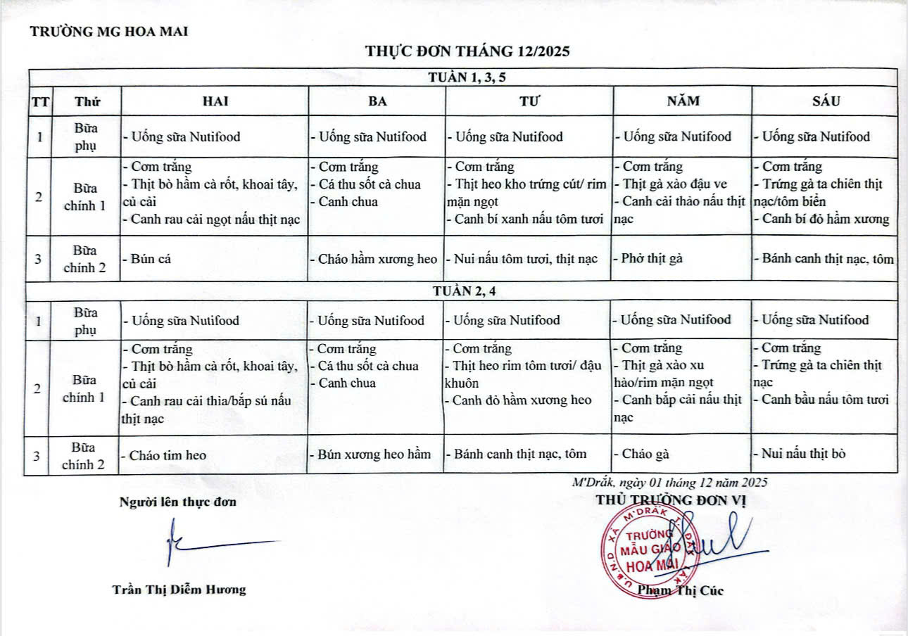 BẢNG THỰC ĐƠN THÁNG 12 NĂM 2025 TẠI TRƯỜNG MẪU GIÁO HOA MAI