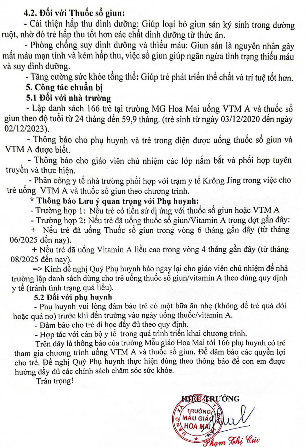 Nhà trường đã gửi thông báo đến các bậc phụ huynh của 166 trẻ theo độ tuổi uống VTM A và thuốc sổ giun theo định kỳ tháng 12 năm 2025 góp phần tạo môi trường chăm sóc – giáo dục an toàn, lành mạnh cho trẻ.