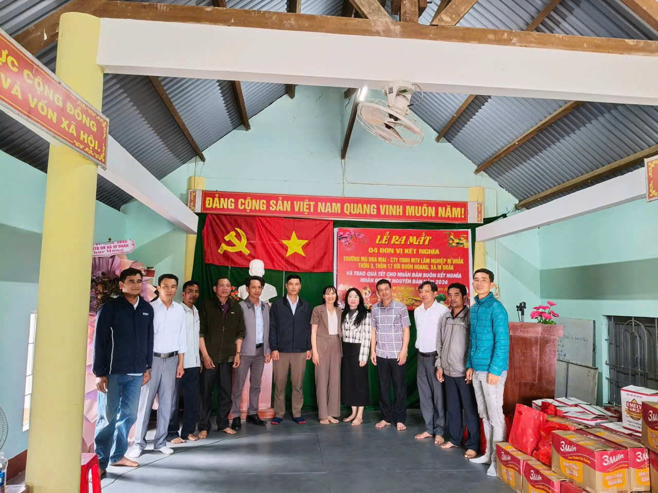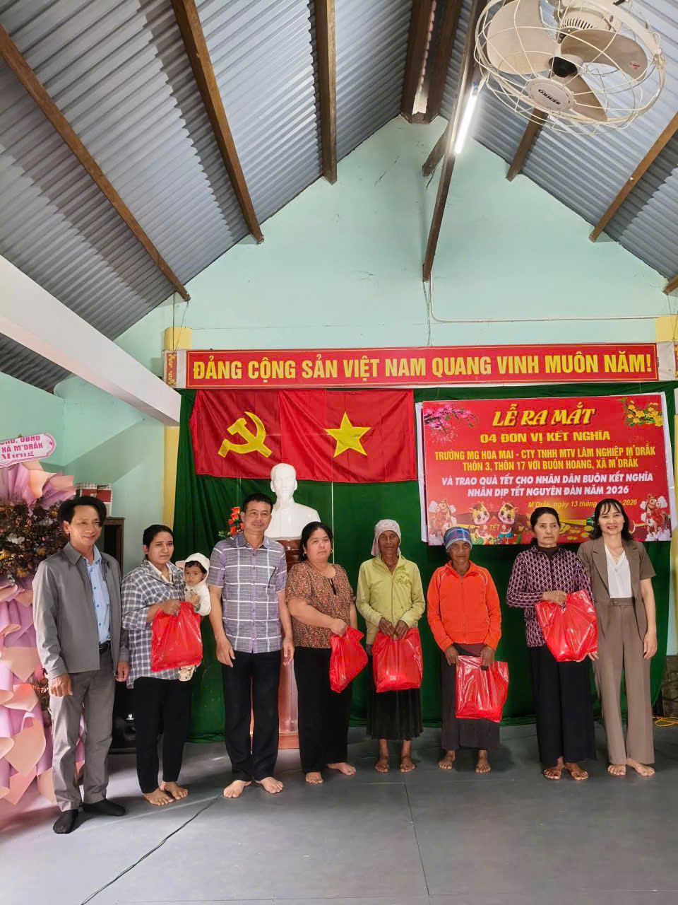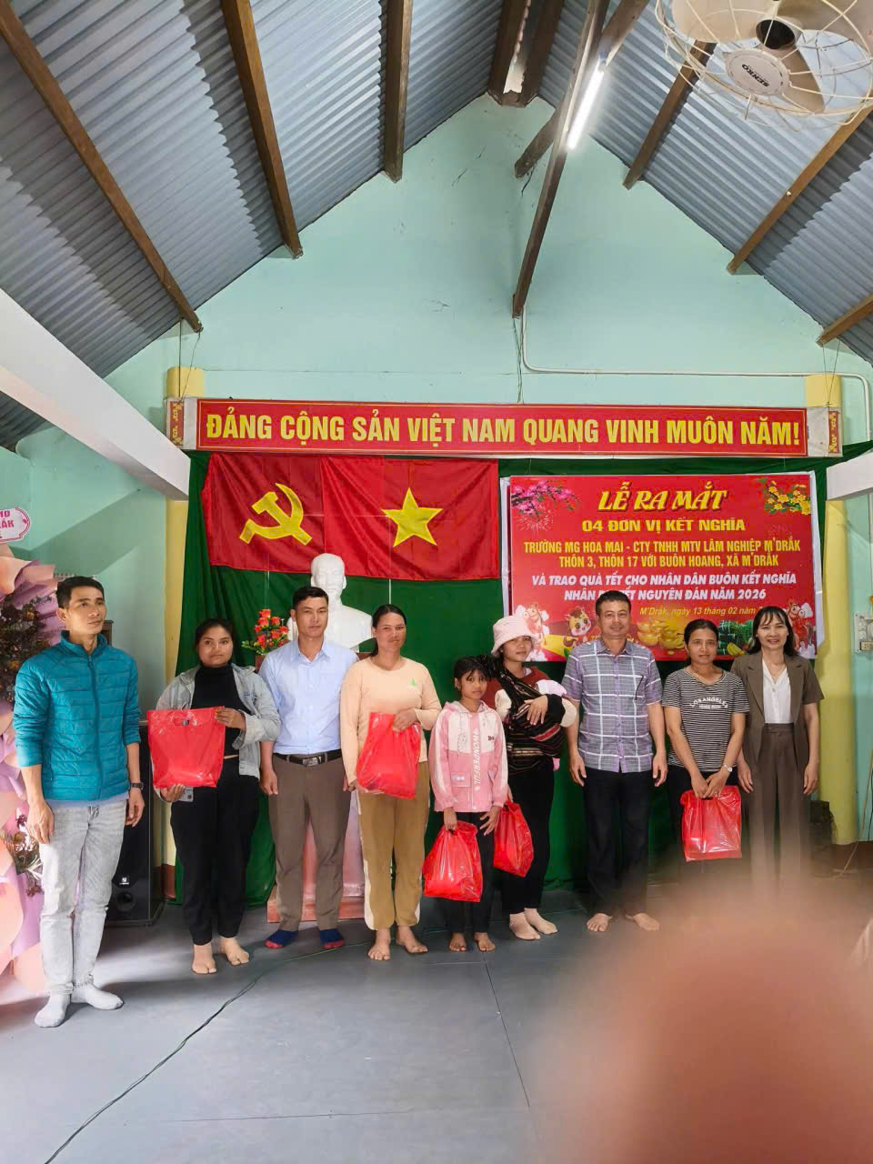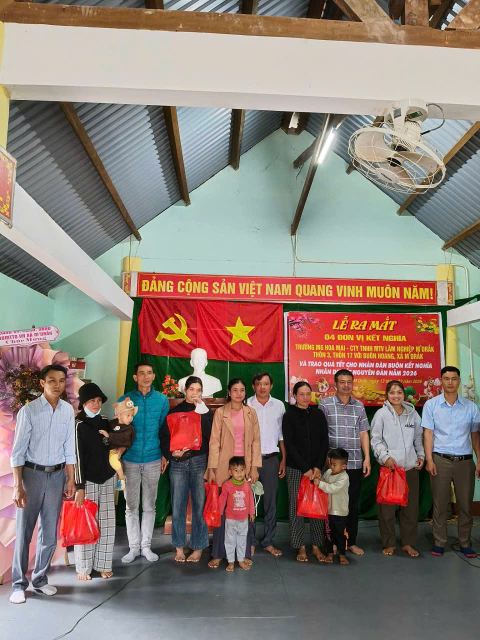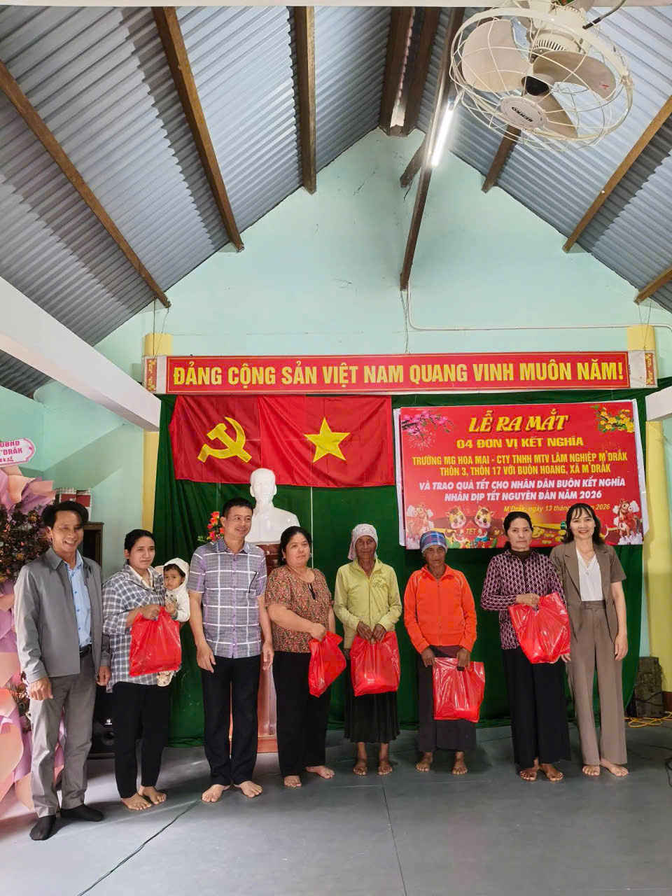 Chiều ngày 13 tháng 02 năm 2026, 04 đơn vị kết nghĩa gồm: Trường Mẫu giáo Hoa Mai (đơn vị tổ trưởng), Công ty TNHHMTV Lâm nghiệp M’Drắk, đại diện Thôn 17, đại diện Thôn 3 đã tổ chức lễ ra mắt và trao quà tết cho nhân dân buôn kết nghĩa nhân dịp Tết Nguyên Đán năm 2026.