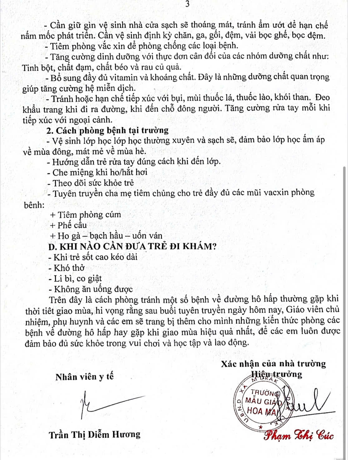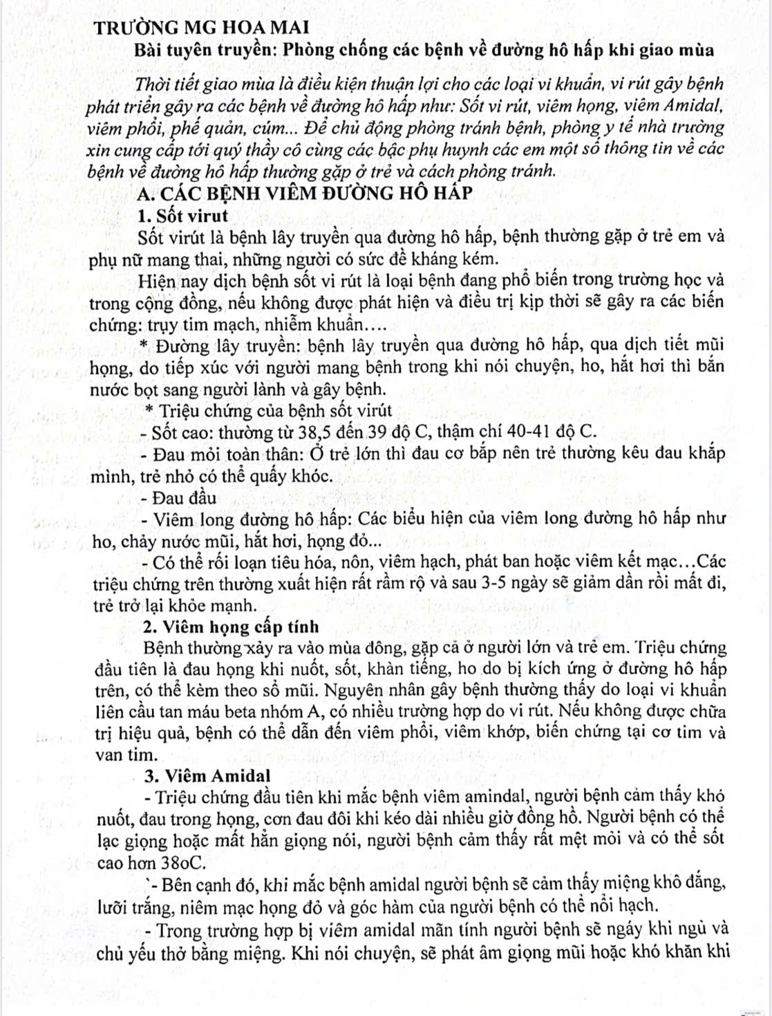 PHÒNG CHỐNG CÁC BỆNH VỀ ĐƯỜNG HÔ HẤP KHI GIAO MÙA TẠI TRƯỜNG MG HOA MAI