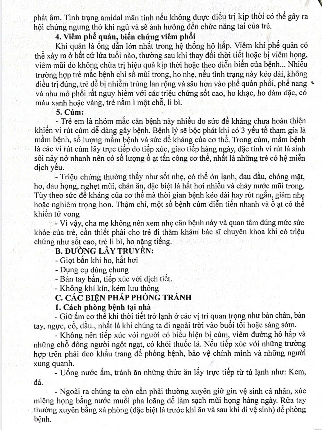 Thời tiết giao mùa là điều kiện thuận lợi cho các loại vi khuẩn, vi rút gây bệnh phát triển gây ra các bệnh về đường hô hấp như: Sốt vi rút, viêm họng, viêm Amidal, viêm phổi, phế quản, cúm… Để chủ động phòng tránh bệnh, phòng y tế nhà trường xin cung cấp tới quý thầy cô cùng các bậc phụ huynh các em một số thông tin về các bệnh về đường hô hấp thường gặp ở trẻ và cách phòng tránh.